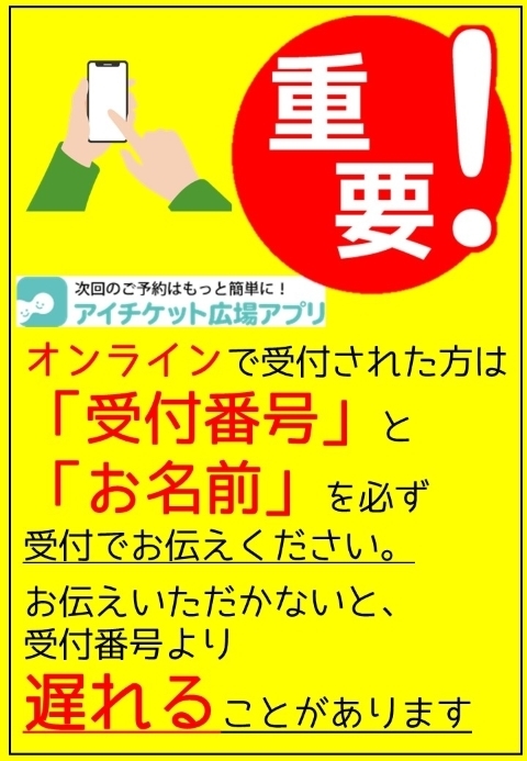 遅れてお越しいただいた場合は、呼び出しが遅れますのでご了承ください。